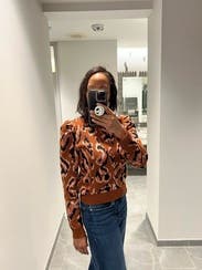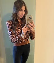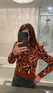 I absolutely adore this sweater, the cropped length with the puffy shoulders make for a very flattering shape. The oversized leopard print in the unusual pink/orange combo makes it reminiscent of an animal print or something else organic, inspired by nature without the fierce in your face vibe some animal prints do and makes it super versatile. I ended up buying this one and wear it all the time!
