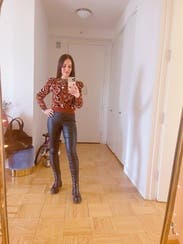 Loved this style and pattern. It’s a thick, warm sweater so definitely best for cold winter temps. Wore with faux leather pants and boots.