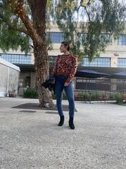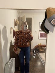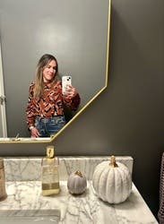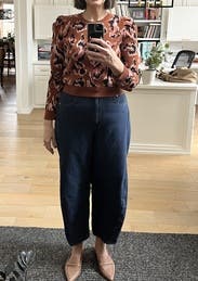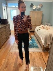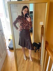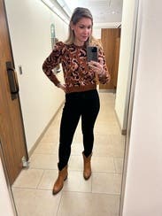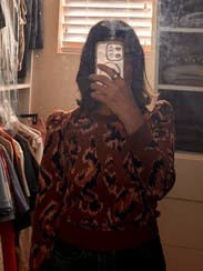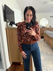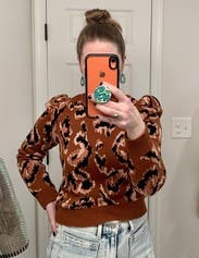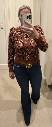 I love this animal print sweater for fall. It’s almost a cropped sweater but was fine with high waisted pants and gave me no trouble. It’s a lighter weight sweater good for mild winters or fall. It’s not overly cozy but thick enough to keep you warm. The puff sleeves are a nice detail. I’m keeping this another rent cycle because I love it so much. Can be dressed up or down!