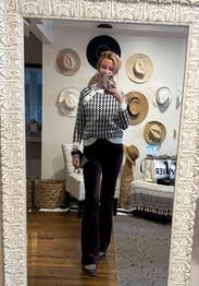 Easy to throw on with leather pants and heels or jeans and sneakers. Paired with gold jewelry.
