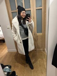 Love the pattern and material, great quality! Rented this for vacation in Iceland , Copenhagen and Sweden. It was. Very warm but also stylish. I loved it. Just runs longer or loose…