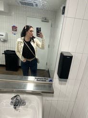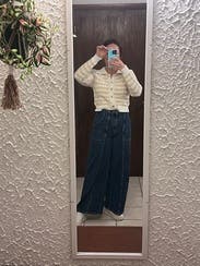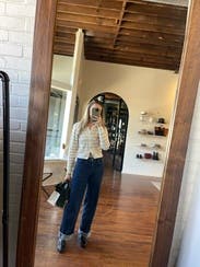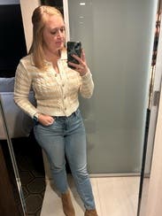 I rented a size up (already tried in a medium) and liked it better. It buttoned better across the chest and wasn’t as tight. It’s a cute cardigan and easy to wear/pair for an outfit