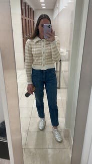 Very cute and loved the gold buttons but More cropped than on the model and very tight. I sized up base on reviews and large fit like a size small. Sleeve length was tall friendly though.