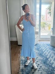 I love the color of this dress and how it fit from the waist down. I have a smaller chest and because there are buttons going down in the front, it does tend to weigh the dress down a bit. Because of this, I found that I often had to pull the dress up in order to fully cover myself. Definitely something to note especially if you aren’t someone who has a fuller chest.