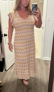 The details of this dress were gorgeous and I was pleasantly surprised by the fit. I think the key hear is sizing down to obtain a more flattering fit than what is shown on the model. This is knit so it does stretch a bit with wear but overall super comfortable. Loved the ruffle sleeve.