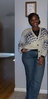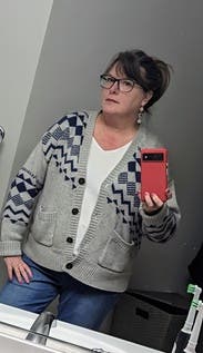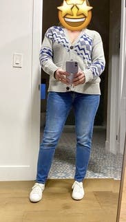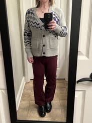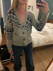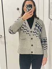 This cardigan caught my eye because the diagonal placement of the pattern looks more interesting than a traditional Fair Isle cardigan. The blue and gray colors are very versatile. The fit is large; I sized down to small instead of my regular medium per RTR recommendation, and it was still boxy and not very flattering. When buttoned, it was too low-cut to wear without a shirt. I didn’t find it itchy as some reviewers did, but it wasn’t particularly soft.