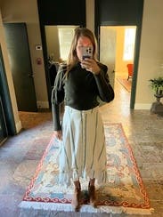 This was cute and comfy. It does run short. I wore high waisted jeans to make sure belly stayed covered.