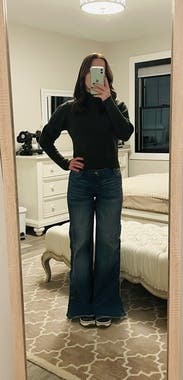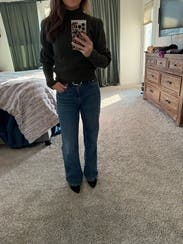 As everyone else mentioned it is on the shorter side, but I wore a bodysuit underneath so it wasn’t really an issue. I love the sleeve. Fabric is a bit thick, so it can be a bit warm if you are wearing it to work and have hot flashes like I do….😏. But other than that…it’s a cute sweater.