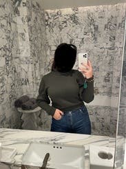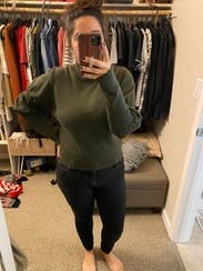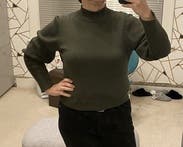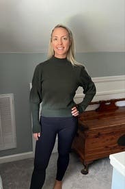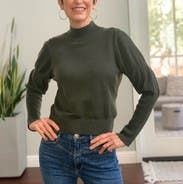 Loved this hunter green neutral sweater. Perfect for the holiday season without being annoying. I liked the subtle puff sleeve detail. It was just enough drama without being overwhelming. The material was thick (not itchy) but not stretchy, so it was a little tight getting over my head. I did not mind the cropped fit because I prefer high waisted pants. I really liked this sweater and will be ordering again!