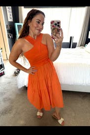 I'm a wine writer and I wore this during a wine trip to Campania, Italy. My favorite color is blue, but I started wearing orange recently since it's on the opposite side of the color wheel and compliments all my blue accessories! I got a lot of compliments and it's very comfortable...the top was a little bit tight but overall it fit really well. Going to wear it again before sending it back and I'm sad to part with it! **I've now rented this dress three times and I can't get enough of it...I should just buy it!