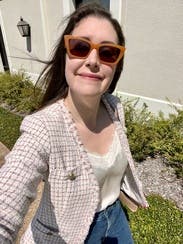 I rented this because I thought it was cute but it is absolutely stunning in person! I loved this blazer so much. It fit well but was a bit tight with my arms crossed and the arm length could have been a bit longer. But I think it may have been too big if I sized up. I loved everything about this and will probably rent again. Beautiful pink color throughout and gold accents.