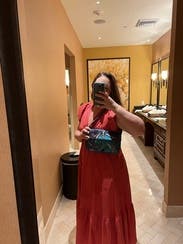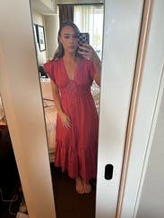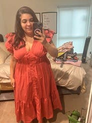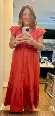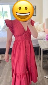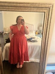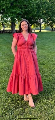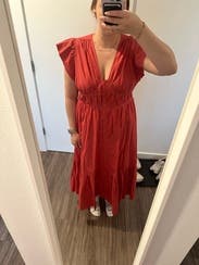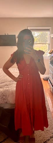 Great material and flattering cut but I ended up swapping out because the dress was too big. The dress has an elasticated waist in the back so you could definitely size down 1 or 2 sizes. Also worth noting that it looks pink in the pictures but in real life was much closer to a nantucket red.