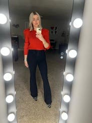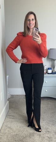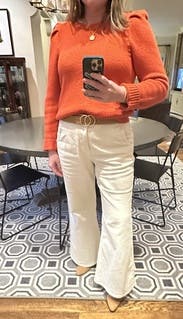I wore this sweater to work with cream, trouser jeans, and I am seriously thinking about buying it. It was so cute and easy to pair. The sweater is a little thick, but it’s not a hot wool even in Alabama. It’s such a great elevated sweater!