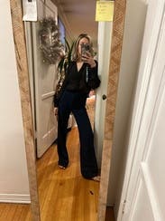 Occasion: Night out. Speakeasy pre dinner, dimly lit restaurant for eats. Paired with: black faux leather pants and bright earrings Fit: Great even for a mom of 3 who occasionally works out but has that sugar induced midsection. Wore tucked in. Just a touch of sheer and shimmer. Amount of sheer would be different for a day event so would need some eat well and workout days prior. Size:
