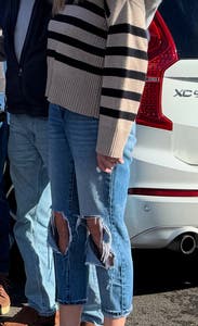 I love this sweater! Looks super classy with black denim and was so comfortable. Runs true to size, light weight sweater. Loved the wider arms and looked great with a front tuck. This was my favorite piece of the items I rented this time around!