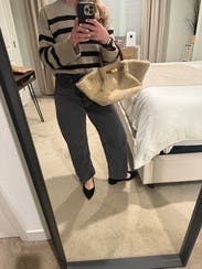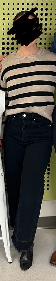 I loved this sweater and thought about buying it. I loved the way the sleeves were a little wider and not snug on the wrists and the bottom hem laid nicely so you didn't have to tuck it but could if you wanted to.
