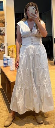 I wanted to love this dress. I like the color and the waist was very flattering. It was light weight and airy. But it was too low for me and also my boobs did not fill it out (and this is normally not a problem for me). I also did think it looked as expensive/high quality as I expected given the designer and the price point.