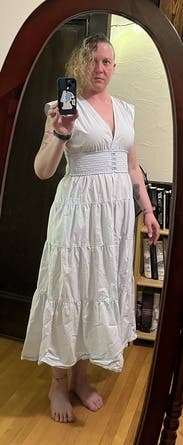 Versatile dress. I wore a tank top under it because the V was deep on my chest. Maybe size up so the line at the bust doesn’t hit in a weird spot. Wrinkles easily so keep that in mind if you don’t have time to steam (like the picture🙃).