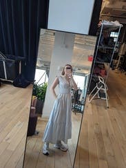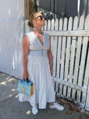 I rented the Derek Lam Collective Tiered Dress in size IT 44/US 8 and it fit like a glove through the bodice. The fabric is a lovely ice blue poplin, which means it's a lightweight cotton, but with a denser weave that gives it a higher end feel and finish. This is the kind of dress you can wear for an elevated casual look while strolling Europe's finest art museums or attending a fancy tea party. It has low-key taffeta vibe and sound, so it can definitely be worn for a cocktail dress code event. It all comes down to how you accessorize it! It's not quite formal enough for a black tie affair, though. I'm busty, so it was a little too low-cut for me to feel comfortable without something underneath. It does have a hook and eye closure at the chest, but that wasn't high enough for my preference lol. If you prefer a little modesty, definitely opt for a lace camisole or simple tank underneath. I opted for a casual look when I styled it, and wore a pale grey tank under the dress. I paired it with rainbow checkboard Vans, and in one photo I'm carrying a vintage blue Coach Bixby sling bag. In the other photo I'm wearing a vintage blue Coach waist pack designed for the '95 Olympics. I wanted to show that the silhouette of the dress is well suited for any kind of bag. Happy accessorizing in your own way! Fabulous dress - would rent again!