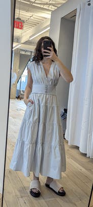 I loved this Breezy and Classic dress from Derek Lam Collective! The opening of this dress is a little loose even with the hook and eye at the center V, so I would recommend a cami underneath or maybe pinning the top together to keep the top secure. Nude undergarments recommended for the light color.