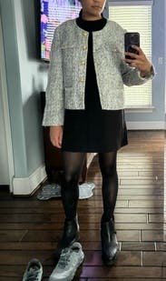 I wore this for work and it was so classy and sheek! It reminded me of the classic Chanel jackets. Very warm, comfortable and fit well. Loved it!