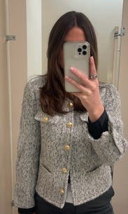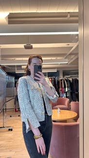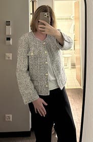 This grey tweed jacket is the perfect mix of classic and cool. With its timeless tweed fabric and structured fit, it instantly makes any outfit feel more polished without being too formal. The soft grey color is super versatile, so you can throw it on over anything—from a nice blouse for work to a simple tee and jeans on the weekend. It’s that piece you’ll keep reaching for when you want to look effortlessly put together.
