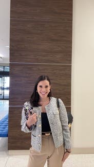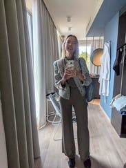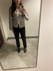 Brought this blazer on vacation with me and it took up quite a bit of room as it’s fairly thick and warm. Great for layering in the winter time or as a solo jacket to wear for late fall/early wintertime. This blazer looks great with both jeans and over a dress- it dresses up any outfit. I found the zip up sleeves a bit odd and the blazer also felt itchy to me around the neckline. I also felt like it made me look boxy so maybe next time I will size down.