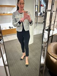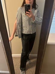 Great work piece that feels expensive. Chic power dressing! The sleeves unzip for a nice touch (great if your office has various temps!) it’s pretty thick fabric, so wear in winter or as an early spring layer. If you have long arms, the sleeve length is a little short. I styled with jeans but this would look great with trousers or a dress too.