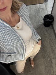 This is a nice lady jacket with a unique pastel blue houndstooth fabric. It looks elegant, and the silver buttons are a great touch. I felt that it ran a bit small when fastened, but the cropped length was perfect with high-waisted pants.