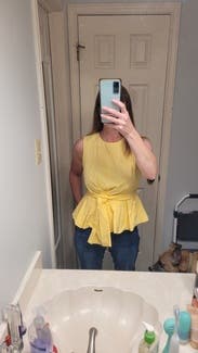 Branching out and trying to wear yellow! This too is so well made and a great bright yellow. Loved it with the linen lemon shorts. Received multiple compliments! The top does run a bit small if you are large busted.