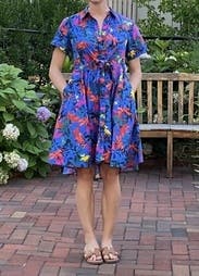 Flattering and easy dress with a tie at the waist to create a tailored fit and flare shape. Charming dragon fly print. Loved it!