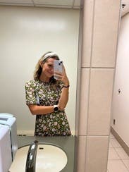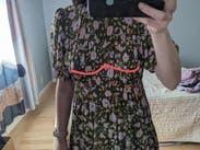 Cute dress! When you look up close at the fabric, the colorful parts are actually little butterflies and birds. The elastic on the sleeves was pretty tight, but other than that it was a great fit. Only thing missing was pockets!