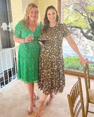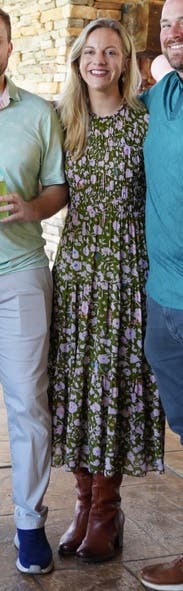 Such a pretty dress I can’t help but keep renting it! Has a little give in the waist/chest and love the flowy skirt!