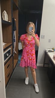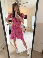 I know it has mini dress in the title, but I still found this dress a little short. Because of the tulip hem and wrap style, the slightest breeze risked showing my underwear. The colors and pattern are so cute, but if you’re tall you might find it challenging.