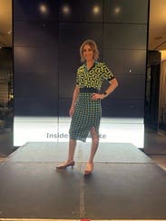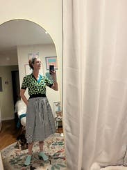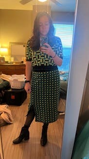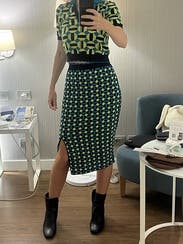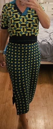Second time renting this set. I wore the top tucked in the skirt. Love the print, colors, and construction. Debated purchasing, but controlled myself.