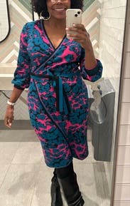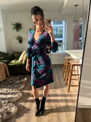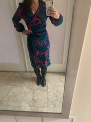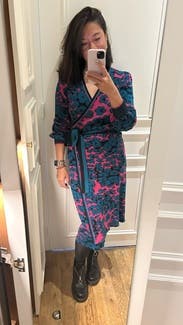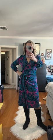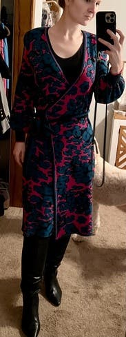 DVF does not disappoint. Wrap dress + sweater dress in one. The material was thick and high quality. I loved the colors. The fuchsia is such a nice pop of color and makes the dress feel more modern. I wore it with black boots to work and for a night out. Really versatile. About 5'5", 118lbs, and the XS fit perfect.