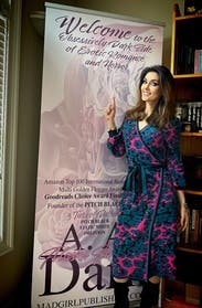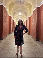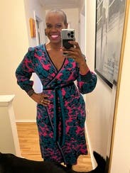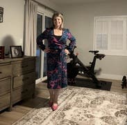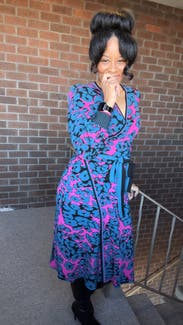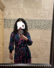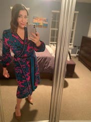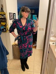 I love this dress. I gained 20 pounds during the pandemic so it has been challenging for me to feel sexy just because… This dress is flattering - it's a nice thick material so it's not too clingy and the sleeves are super cute. It's sort of a heavy cotton, not wool, but it's nice and warm for a winter night out. And the colors are really vibrant and unique.