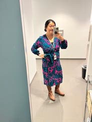 Great colors and fit! Loved the sleeves and the neckline. The skirt portion opens a little more than I would have liked but totally manageable. All in all a great work option.