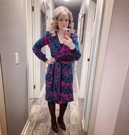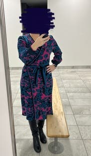 Pretty, heavy knit dress that wraps generously over the chest area. Nothing worse than having to wear a camisole under these types of dresses. It's cold where I live now so hopefully can wear somewhere beyond the bathroom. :- ) could have worn a small in this as it runs TTS. My size 28 waist 5'7" 138lbs