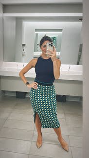 I received both the top and the skirt with the tags - added bonus to be the first to wear this combination. I loved this form fitting look with zaps of neon lime, turquoise, black and navy. There aren’t any buttons or zippers on the skirt - which I love! Plenty of stretch and a little high waisted. I tucked in the matching top for a more streamlined look. I received many compliments and it was a fun little number that can be worn with the matching top or something else. Loved the sexy slit, not too high, just a sneak peek.