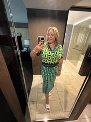 Fits well and stylish - perfect for business casual or date night. Can match easily with black top . Added turquoise jewelry. Green is nit primary green but turquoise & matched with bright yellow.