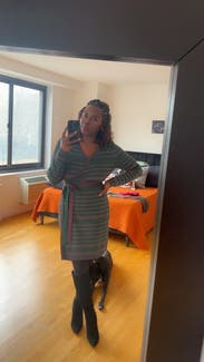 I am always cold in my office so despite this being a “fall/winter” offering, this was great for me at work where I always lose the thermostat wars. This dress is cozy and soft, has beautiful colors and pattern, and stayed closed, which is always a concern when I get a wrap dress. I could’ve worn without anything under on top, but put a cami on just to be sure since I wore it to work. Overall, it was a DVF win for me! 💜