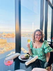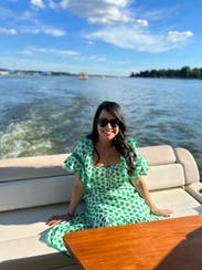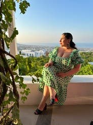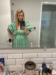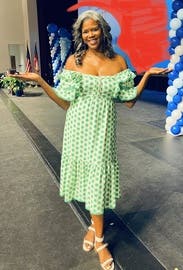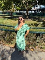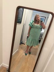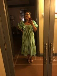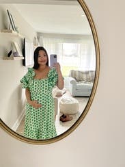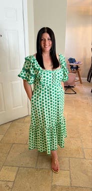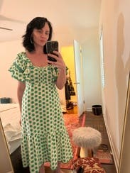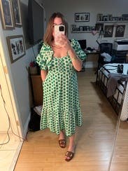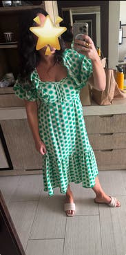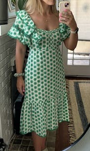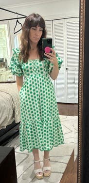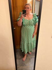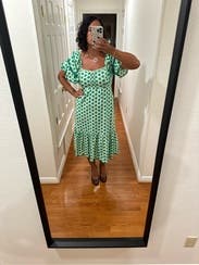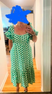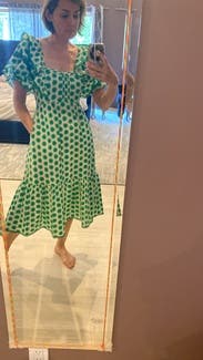 I enjoyed wearing this dress. The green is beautiful and bold. Very flattering on the arms. I was a tad self conscious about me tummy pooch but I’m a curvy gal and focused on body love. I wore this for a date night with my husband.