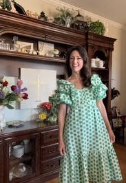 Ruffle details on puffed sleeves add extra feminine detail to this pretty polka dot dress from DVF.