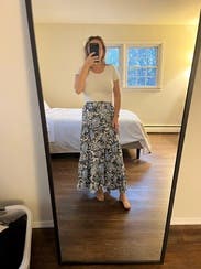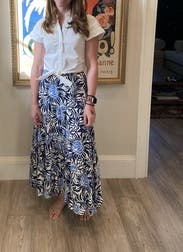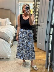 This woven skirt runs a little big in the waist (not elastic) and is nice and long - at 5’9” works well with heels as a midi or flats more maxi. I wore with a tank and blazer.