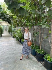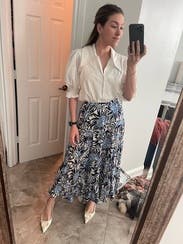 I wore this skirt for work but i feel like it could be paired with a different top and sandals and totally work for a tropical vacation. The fabric was a linen but didn’t get wrinkly from sitting. A zip closure and the waist just fit so if you’re in between sizes or prefer having some extra breathing room I would size up.