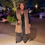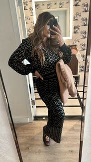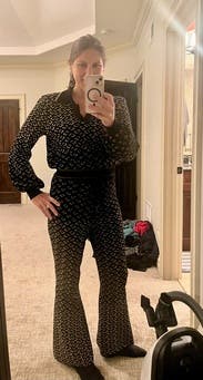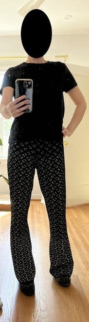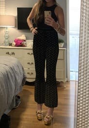Forgot to take a photo which is hilarious considering I wore these pants a bunch of times. They are really comfortable and surprisingly flattering. They feel like sweatpants but the gold thread and flared leg elevate them. Paired them with a gold sandal, a black jersey top and a moto jacket for date night and a girls night out. Will rent again and probably buy.