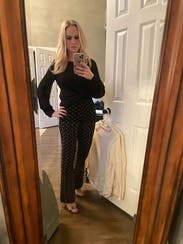 These pants were fashionable and comfortable. At a mere 5 ft, they were definitely too long, but they still looked nice rolled up when lounging around. I mostly wore them with heeled boots and they worked very well with the boots worn underneath. They did stretch out in the knees after wearing, but overall, I enjoyed them. Colors went with multiple sweaters since I didn’t get the matching top.