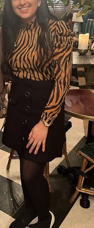 The pattern on this item is absolutely fierce - even more distinctive in-person than online. Loved wearing it for a night out. I will likely size down next time though