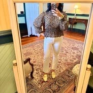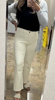 Cute off-white jeans with a frayed edging. I’m typically a 28 but I sized up to a 29 because they’re white. It wasn’t really necessary so you can order your typical size. They are off-white and not a true white. The length is a little different and might be better on someone taller. I’m 5.4”. Overall, they were a nice option to wear for a casual day in the summer and would be fine even going into fall